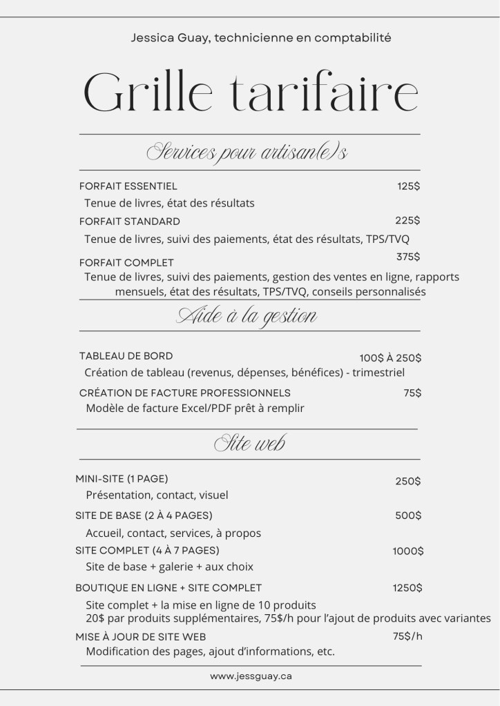 Bienvenu! Voici les services et les tarifs offerts pour les artisanes et les artisans.
